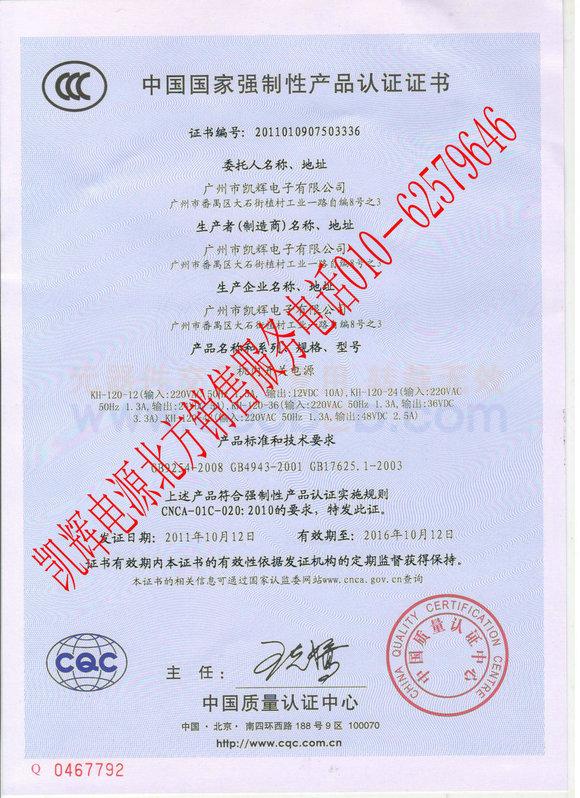 质量认证证书: 凯辉电源3C认证中文版