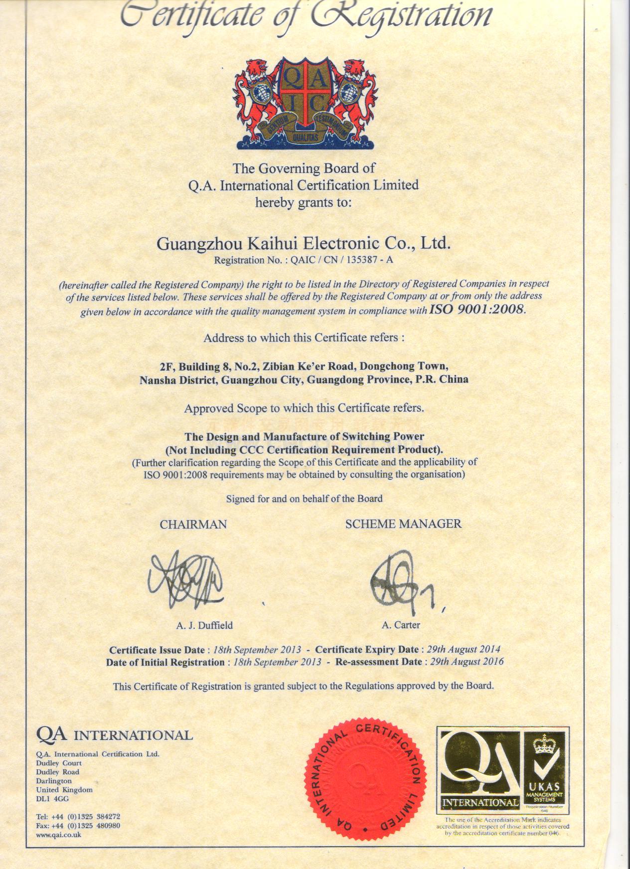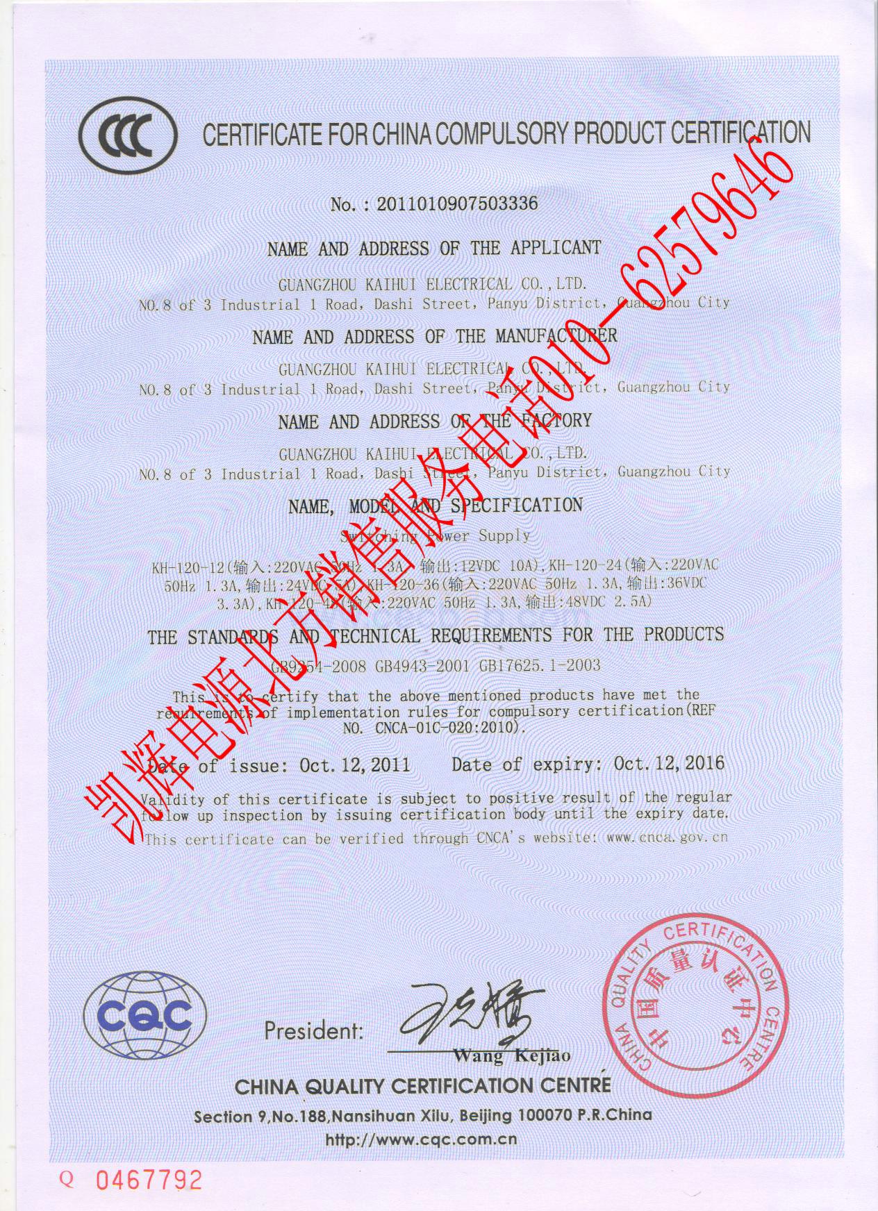 质量认证证书: 凯辉电源3C认证英文版