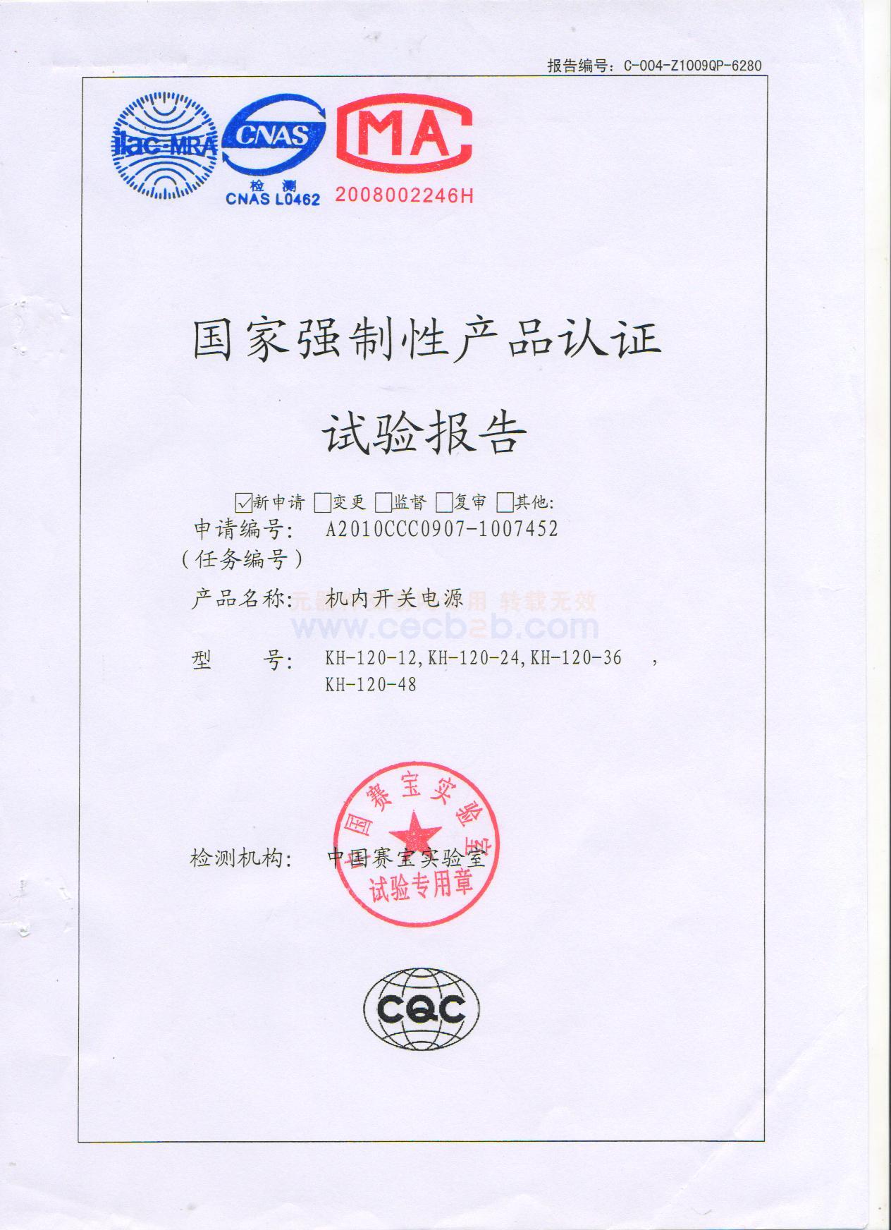 质量认证证书: 国家强制性产品认证实验报告