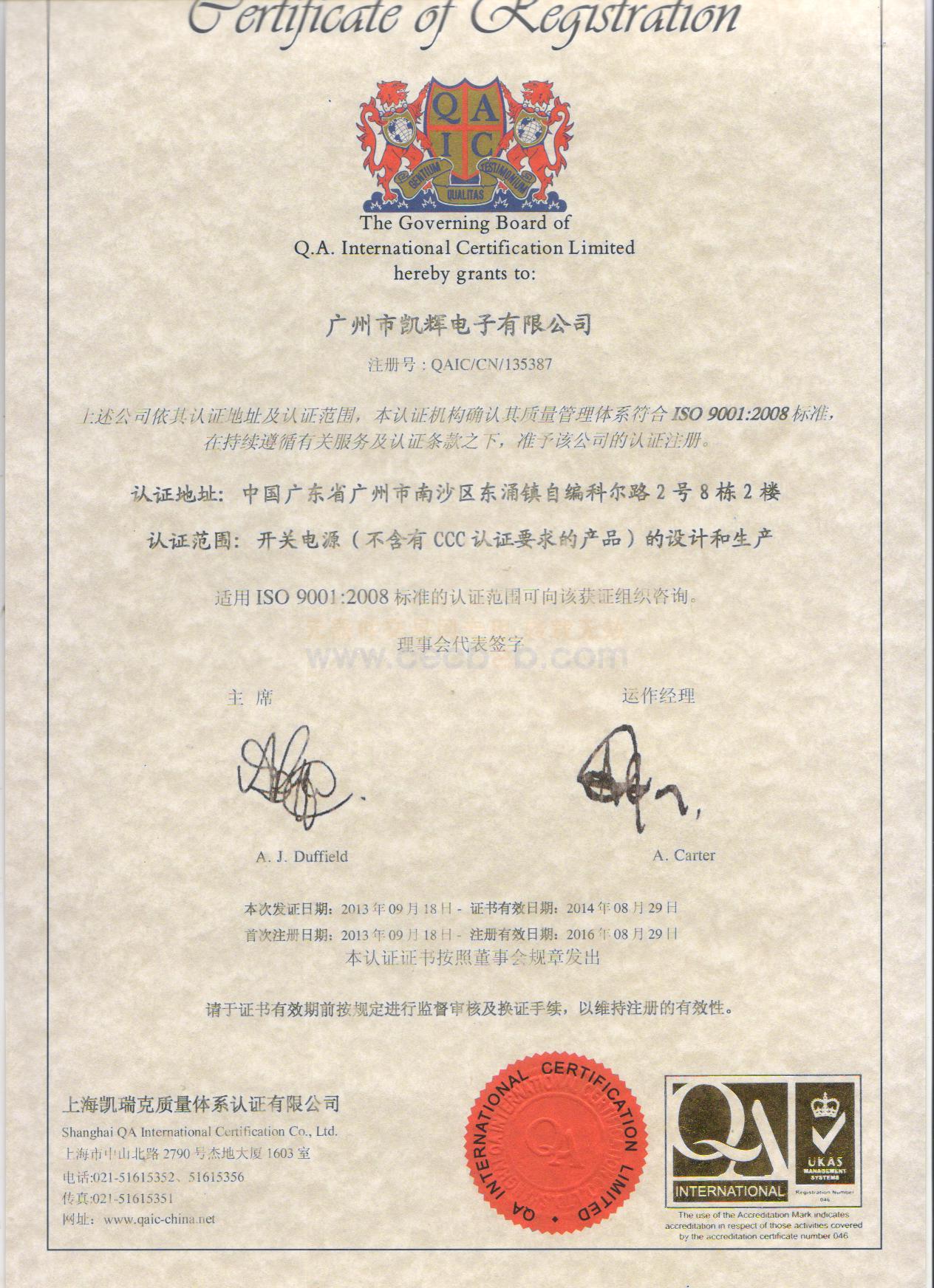 质量认证证书: 凯辉电源CE认证