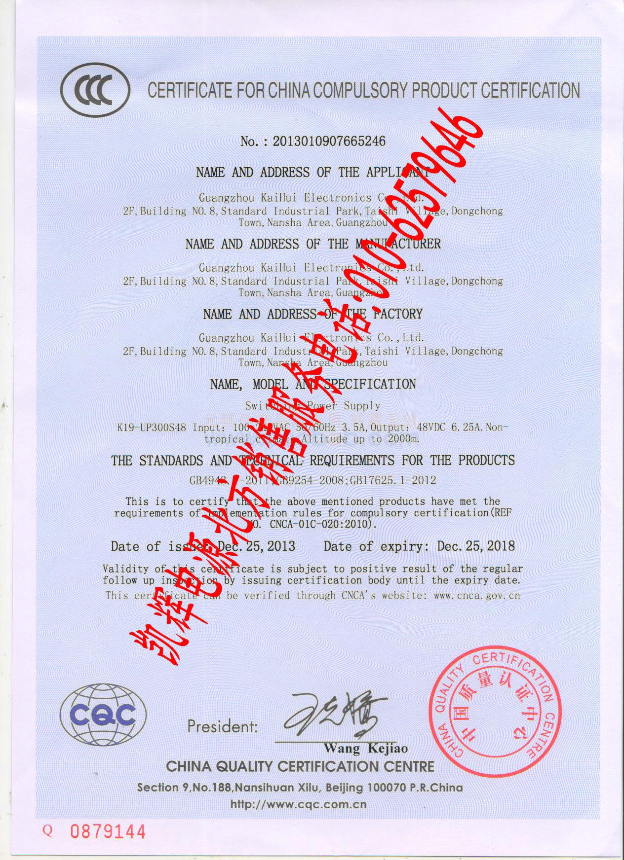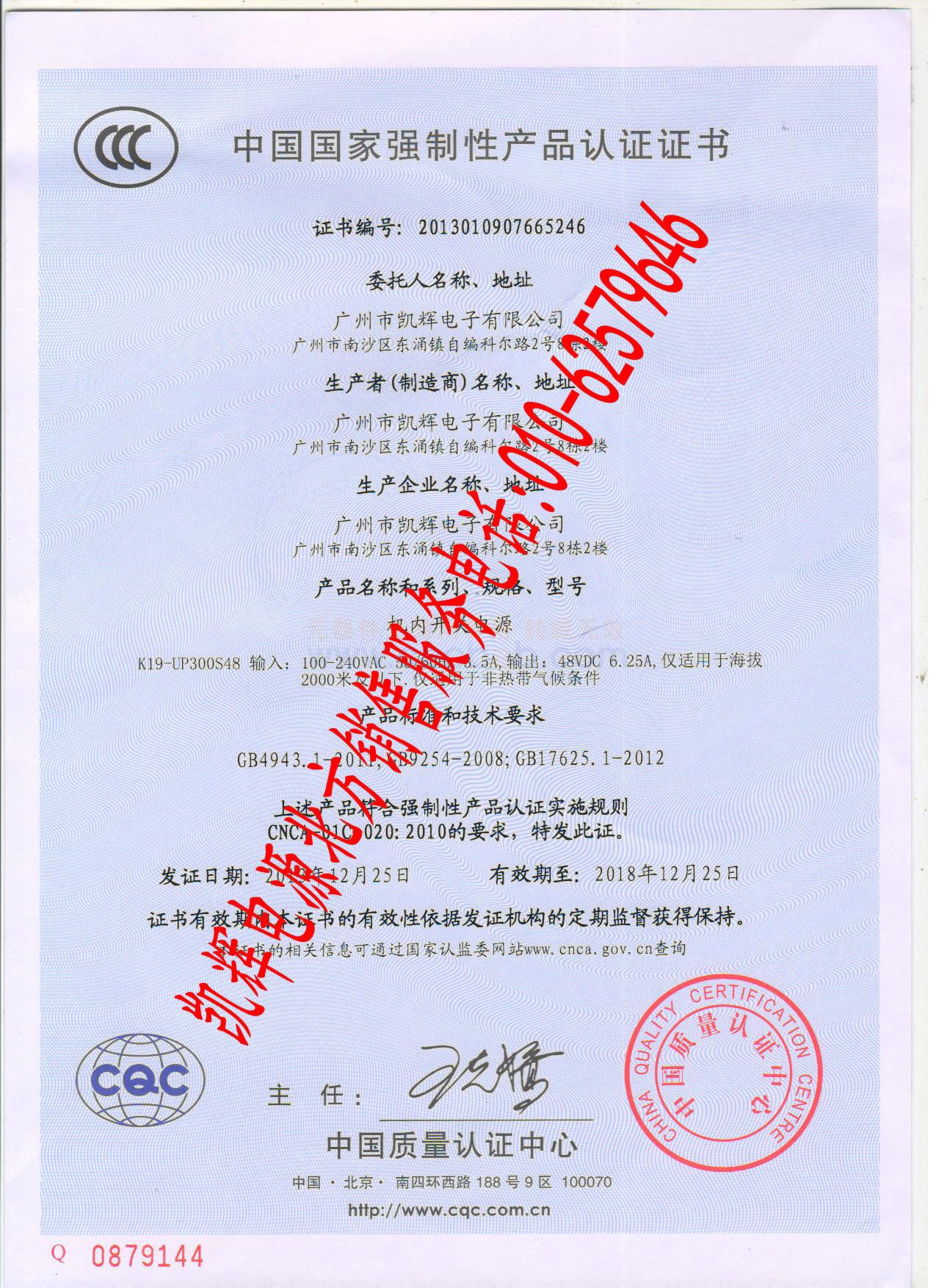 质量认证证书: 凯辉电源3C中文证书