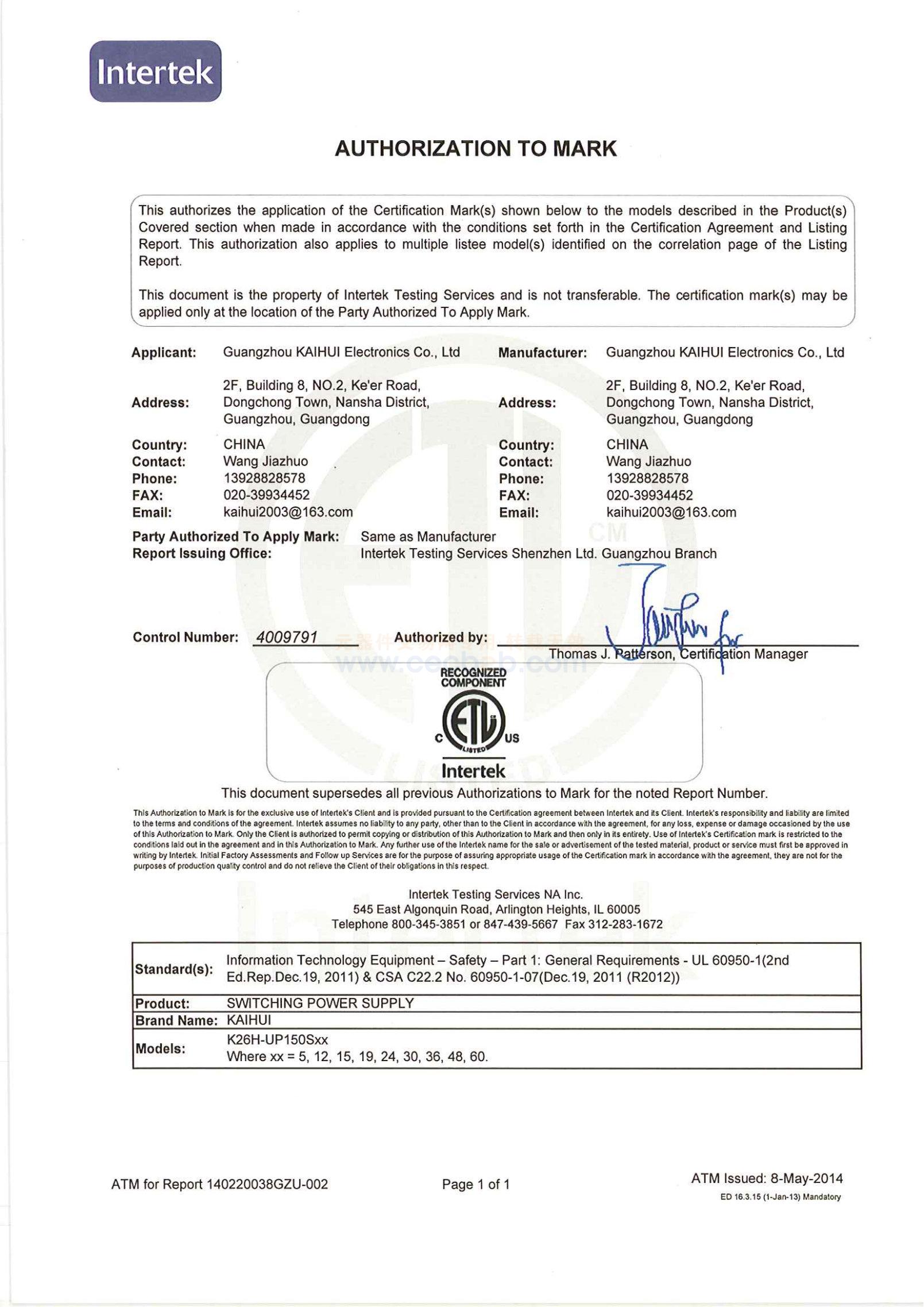 质量认证证书: 凯辉电源ETL认证